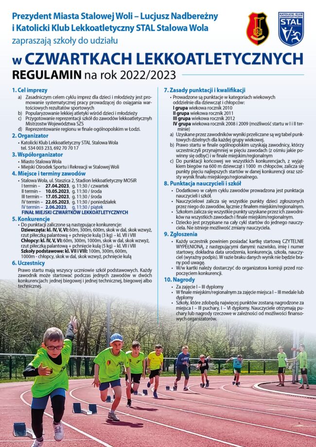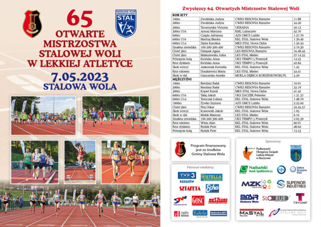 65. Otwarte Mistrzostwa Stalowej Woli w Lekkiej Atletyce 07.05.2023r. stadion lekkoatletyczny MOSiR w Stalowej Woli start zawodów godzina 15:30